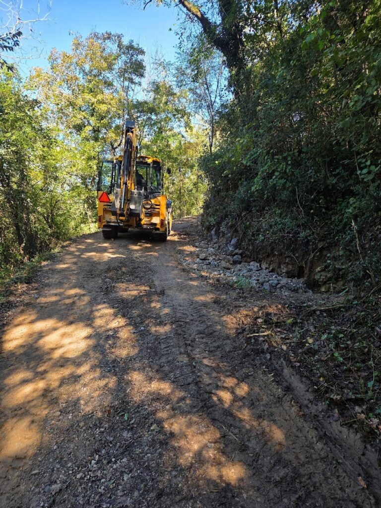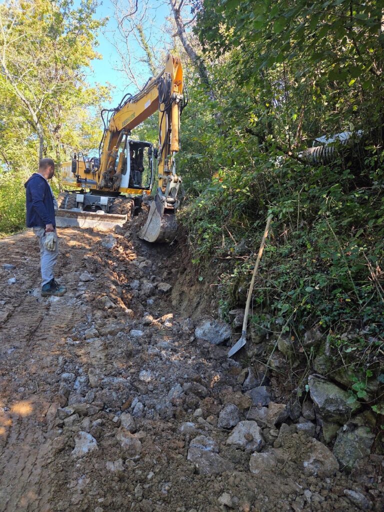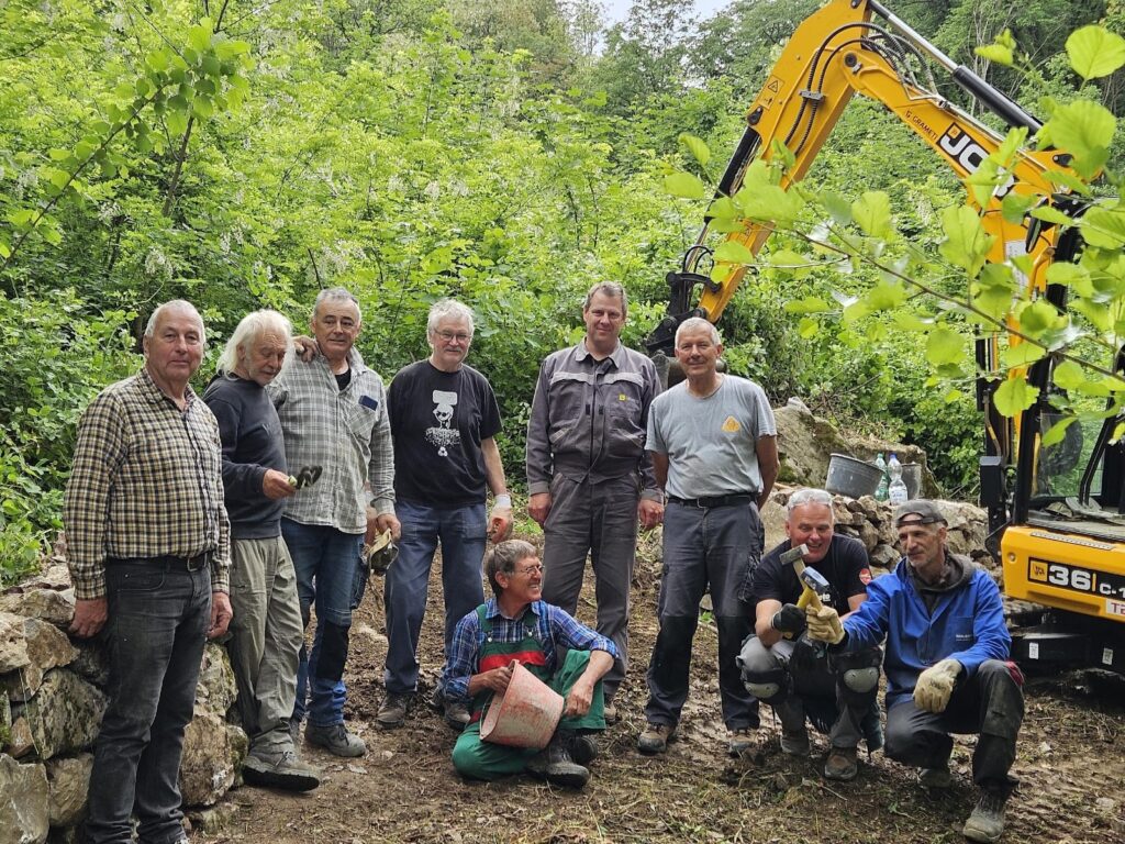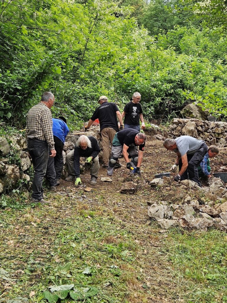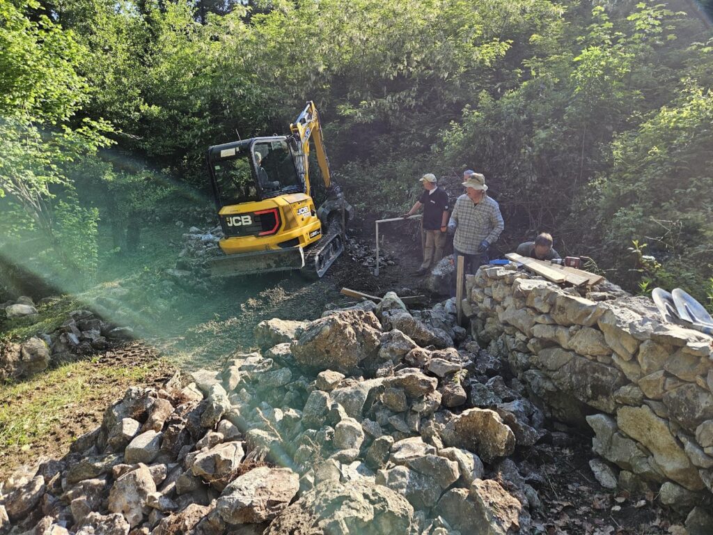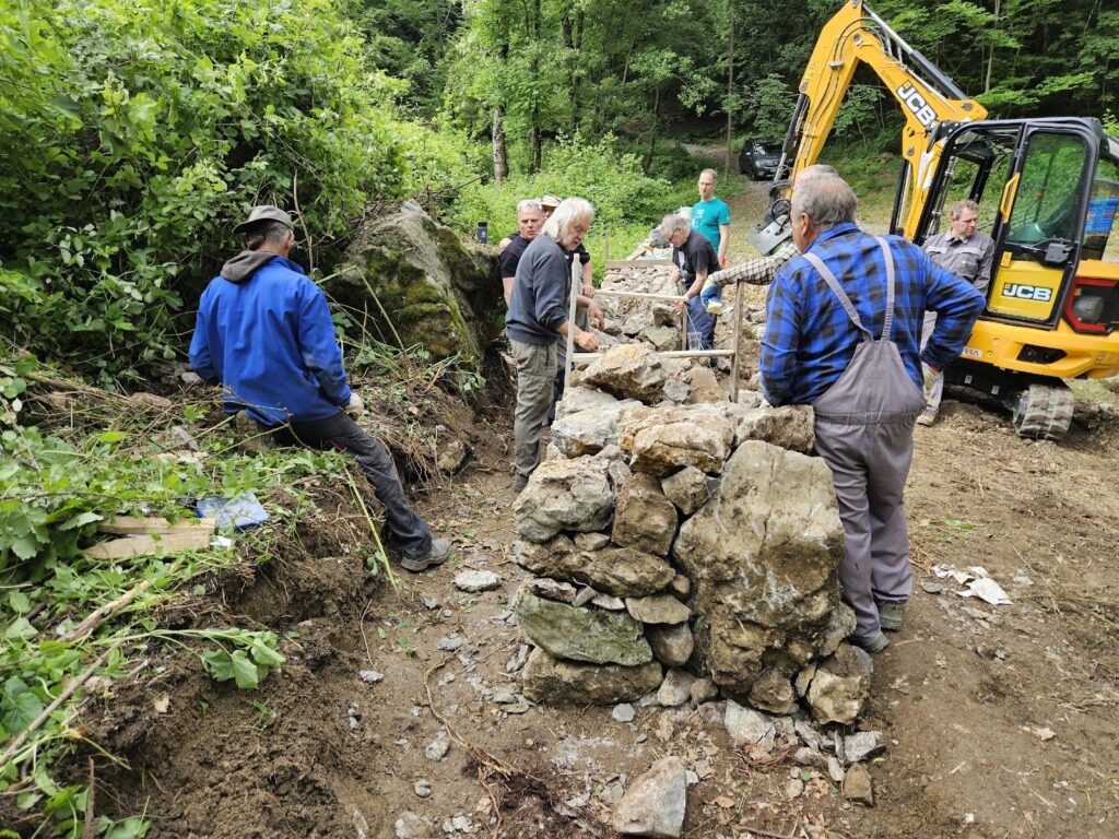 V soboto 17. maja smo ob 7. uri zjutraj pričeli s praktično delavnico. Z gradbenim strojem smo odstranili ostanke obstoječega dela suhega zidu ter očistili tla do trde podlage. Pod vodstvom mojstra suhozidja Borisa Čoka smo pričeli z gradnjo. Po postavitvi težjih kamnov, te smo postavili z gradbenim strojem, smo pričeli z zidanjem ročno. Mojster Čok nas je s še tremi sodelavci usmerjal, kako in kam postaviti posamezne kamne. Postopoma nam je šlo vedno bolje in zid je počasi rasel. Opravili smo lep del izgradnje zidu. Ostalo ga je pa še en de, katerega bomo uredili spomladi 2026